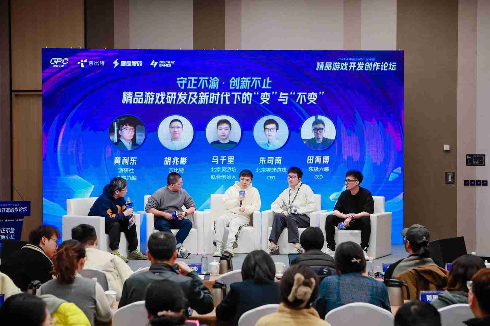 圆桌对话环节,,在游研社内容总编黄利东的主持下,,1winCTO胡兆彬、、、北京灵游坊联合创始人马千里、、、、北京猩球游戏CEO朱司南、、、东极六感CEO田海博等四位嘉宾围绕“守正不渝、、创新不止——精品游戏研发及新时代下的‘变’与‘不变’”这一主题分享了各自在精品游戏开发理念及工程能力搭建方面的见解和经历,,并就行业变化下游戏人需要坚守的理念等展开交流探讨。。